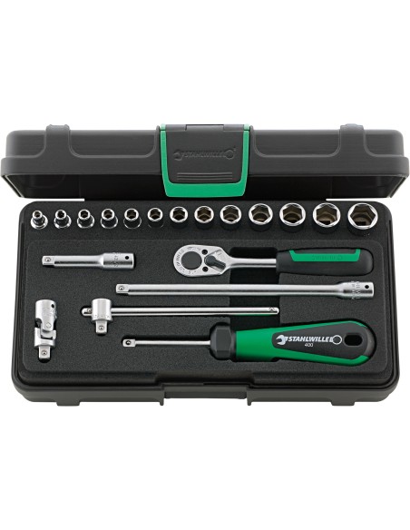 En robusta caja apilable de material sintético ABS, 19 piezas Contenido: 13 Bocas de llave de vaso con hexágono núm. 40: 3,5; 4; 4,5; 5; 5,5; 6; 7; 8; 9; 10; 11; 12; 13 mm 1 Carraca núm. 415 2 Prolongaciones núm. 405/2 (54 mm), núm. 405/6 (150 mm) 1 Articulación universal núm. 407 1 Porta-útiles núm. 400 1 Maneral de cruceta núm. 404