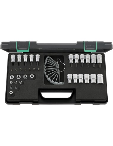 En robusta caja apilable de material sintético ABS, 35 piezas Contenido: 3 Bocas de llave de vaso para tornillos exteriores TORX® núm. 40TX: tño. E4; E5; E6 2 Cabezas de destornillador para tornillos de interior TORX® núm. 44KTX: tño. T8; T9 4 Bocas de llave de vaso para tornillos exteriores TORX® núm. 45TX: tño. E7; E8; E10; E12 5 Cabezas de destornillador para tornillos de interior TORX® núm. 49TX: tño. T10; T15; T20; T25; T27 6 Bocas de llave de vaso para tornillos exteriores TORX® núm. 50TX: tño. E11; E14; E16; E18; E20; E24 6 Cabezas de destornillador para tornillos de interior TORX® núm. 54TX: tño. T30; T40; T45; T50; T55; T60 7 Puntas Para tornillos TORX®-interior con guía de centrado 1440: T10; 1441: T15; 1442: T20; 1443: T25; 1444: T27; 1445: T30; 1446: T40 1 Acoplamiento para puntas núm. 442 1 Galga de TORX® tño. E6; E7; E8; E10; E12; E14; E16; T10; T15; T20; T25; T27; T30; T40; T45; T47; T50; T55; T60
